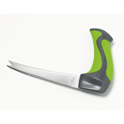 The soft feel, molded plastic handle gives a firm, comfortable grip in either hand. Its non-slip finish improves grip even when hand is wet or greasy. The stainless steel blade is angled to reduce stress and pain when doing food preparation. This vegetable knife has a 6" serrated blade