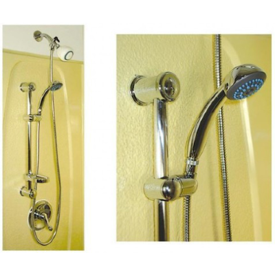 This modern decor showering system comes complete with a wall mounting bar so that the shower head holder can be positioned to suit the bather's height. The bar also has a soap dish. The chrome flex hose is 84" long. The shower head has an on/off button and there is a diverted valve to attach the hose to the existing shower head. All bright chrome plated.Â