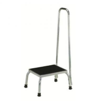 Features a chrome-plated base measuring 12" wide x 16" long x 9" high ; the stool is covered in a non-slip matting for confident use. The chrome-plated steel handrail is 33" tall to assist with balance.
