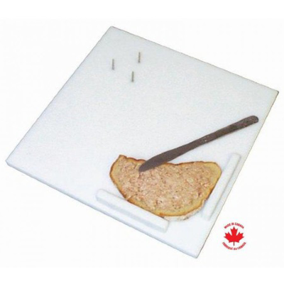 This easily cleaned white food grade polypropylene cutting board has stainless steel spikes to hold food in place for peeling and slicing. The 1/2" high corner guards keep bread from sliding when spreading butter or slicing. Mounted on 4 suction cups for anchoring board securely