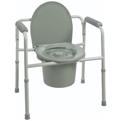 The ProBasics Three-in-One Steel Commode has three versatile functions; it can be used as a toilet safety frame, a commode or as a raised toilet seat. It features a removable back and comes complete with commode bucket, splash guard and lid. The versatile design includes an elongated commode seat, armrests for added comfort, angled legs for stability and non-marring rubber tips.