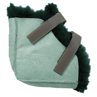 Hi-Temp Green Medical Sheepskin Heel protectors, dense fleece for comfort, comes with 2 padded velcro straps for closure over the instep. No seam at point of elbow for greater comfort & relief.