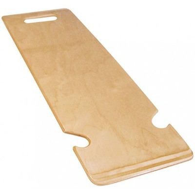 A transfer board with a hand hole for easy carrying and transferring, this transfer board also has notches cut out of the sides for securing the board to the side arm post of a wheelchair. Made of multi-laminated birch plywood with tapered ends