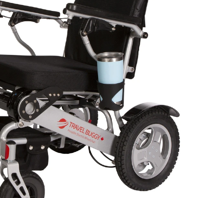 Keep your drinks nearby with our new style cup holder. It fastens easily and securely to your Travel Buggy electric wheelchair. Features flexible width from 2.5" to 3.5" diameter to hold most beverages and keeps a firm grip on your drink