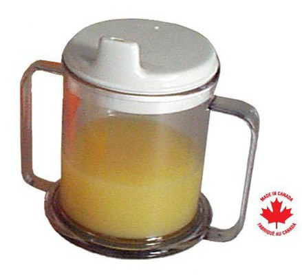 This crystal clear plastic mug has double handles to make drinking safer and easier for people with a weak grasp or tremor. The handles will accommodate four adult fingers and the lid has a drinking spout to prevent spills. The transparent design instantly shows the level of contents. Wide base to resist tipping. Dishwasher safe to 194°F (90°C). Microwaveable.