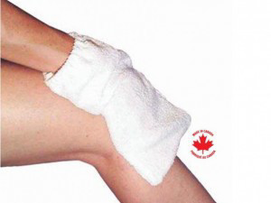 Non allergenic white terry cloth wash mitt with elastic wrist and a soap pocket. Sewn on loop for hanging up or can be pulled on with teeth for one handed washing. Fits either hand.